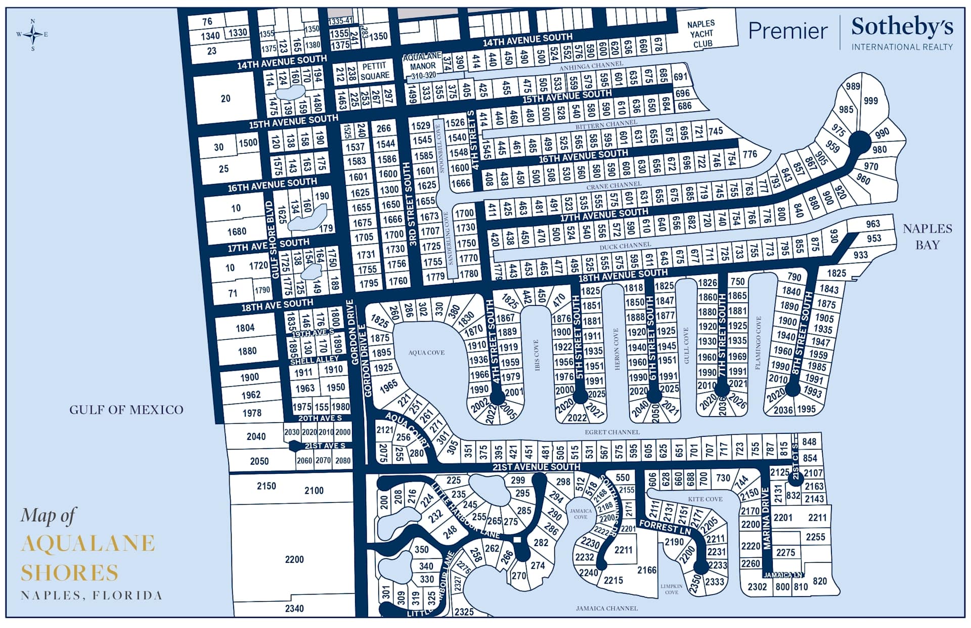 Aqualane Shores is one of the oldest and most desirable neighborhoods in Naples, Florida. Developed in the 1950s from previously unusable mangroves, this private boating paradise boasts deep-water canals leading to Naples Bay and the Gulf of Mexico. Residences feature panoramic waterfront vistas, and docks for sailboats and yachts, and boast opulent amenities evoking the lavish ambiance of a five-star resort.